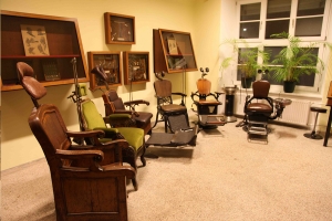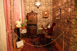 Очень хорошо оформлен кабинет дантиста конца XIX века. Кроме оригинальной ножной бормашины редкой модели, расписанной золотым рисунком, шкафа для инструментов, плевательницы с мраморной столешницей на чугунной ножке, потолочного светильника, даже стены сделаны методом росписи. Кажется, что обои, а на самом деле роспись.