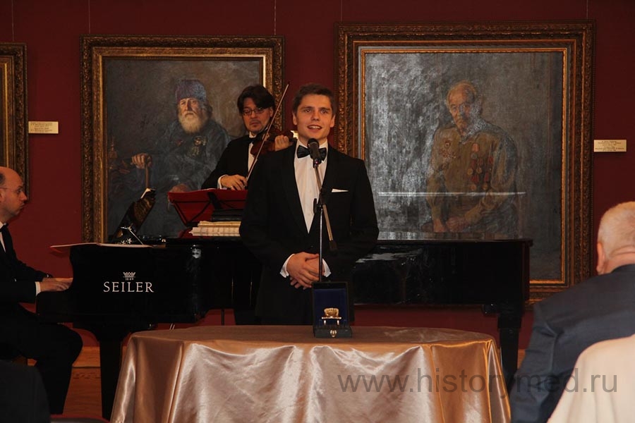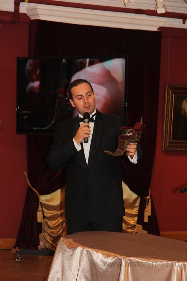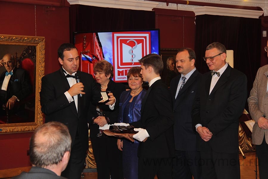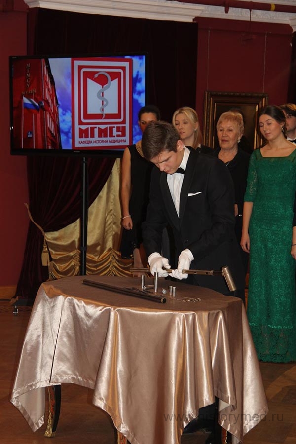 Программа торжества была построена вокруг новых уникальных экспонатов для создаваемого Музея медицины России. Этот важнейший проект возглавляет заведующий кафедрой профессор К.А. Пашков и все творческие и научные силы сотрудников кафедры сейчас направленны на реализацию идеи, которую, кстати сказать, впервые озвучил профессор Н.В. Склифосовский в 1883 году (130 лет назад!). Все от старейшин до самых юных выходили в центр зала и повествовали интереснейшие истории вещей… М. Кречмер читал свои стихи, М. Кленов разгадал загадку старого коллекционера из Европы, который десятилетиями не догадывался о предназначении имевшегося у него набора инструментов. Настоящим бриллиантом новой коллекции стала трость, которая держала в интриге всех собравшихся. С виду это была обычная трость. Ловкими движениями она превратилась в хирургический набор тюремного врача XVIII века. В ее рукояти были ножницы и зажим, а в капсулах ланцеты и троакар. Подготовку экспонатов вели наши кружковцы – П. Шадрин, К. Шадрин, Г. Веселов. В конце презентации, которую обогащали блистательные видеоролики, сделанные под руководством Н.В. Чиж, и живая музыка вышел весь коллектив. Места едва хватило. А это значит, что у кафедры есть не только прошлое и настоящее, но и будущее.