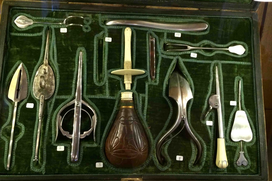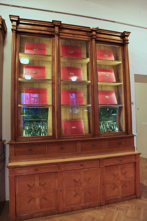Конечно, на фоне такой анатомической сокровищницы, собрание медицинских инструментов и материалов несколько меркнет, ввиду того, что сложно представить себе наличие редкостей – в той или иной мере все повторяется. Тем не менее, пара вещей действительно любопытны. Это трость врача (1860г., принадлежала Willibald von Gunz), внутри которой спрятан стетоскоп, термометр, шприц и даже капсула для порошка. Масштабно смотрится хирургический набор врача Брамбилла XVIII века. Эти инструменты были созданы для Франца Иосифа I. Сафьяновые футляры, бархатные оклады, рукояти пил и троакаров из слоновой кости впечатляют.