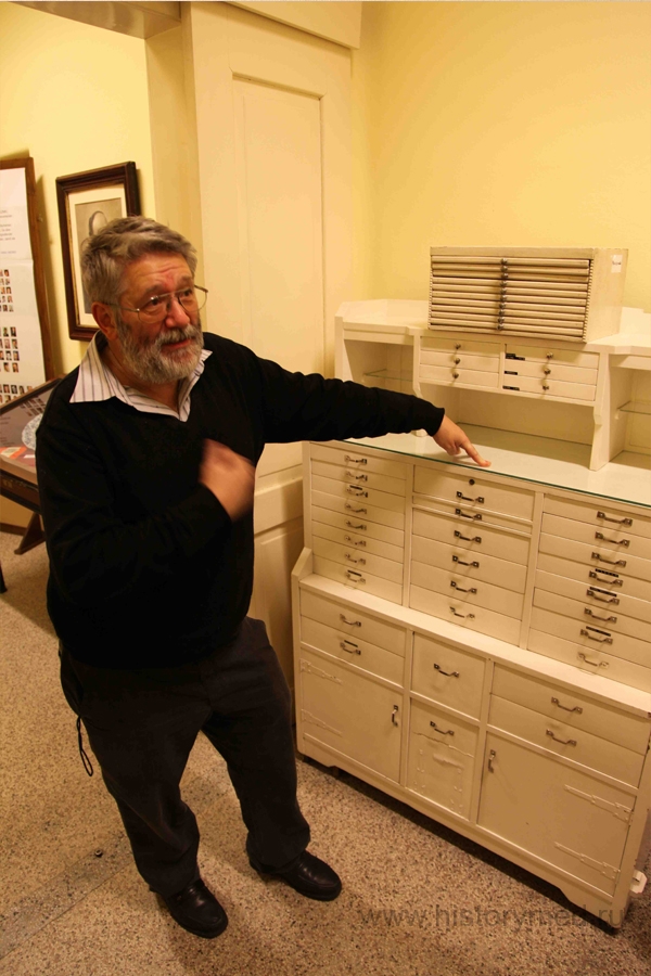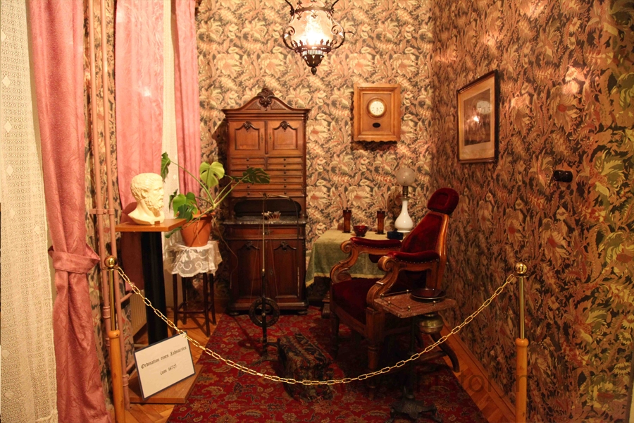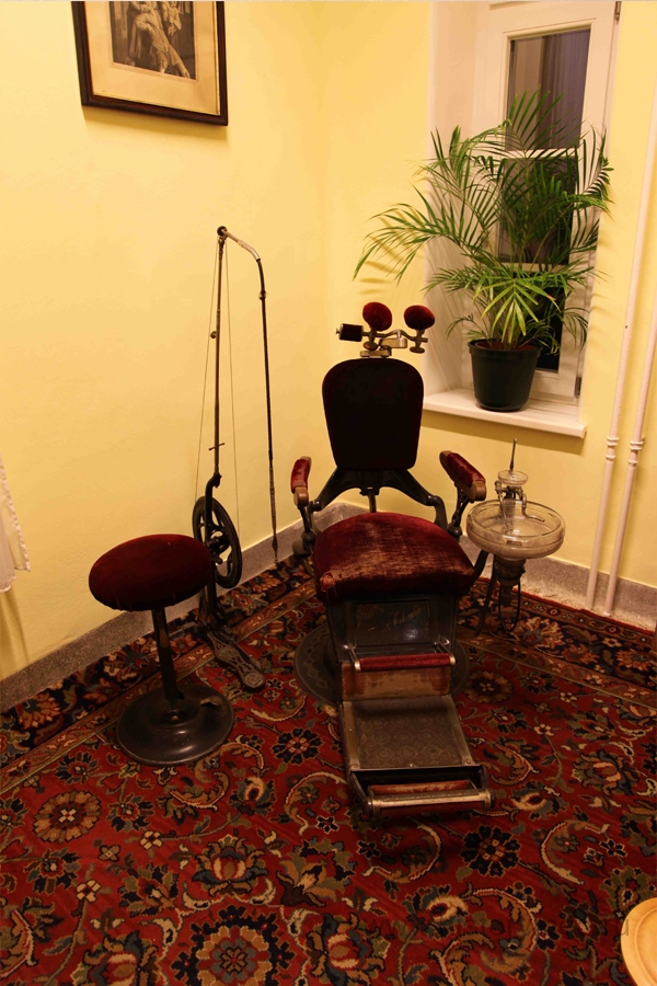 Очень хорошо оформлен кабинет дантиста конца XIX века. Кроме оригинальной ножной бормашины редкой модели, расписанной золотым рисунком, шкафа для инструментов, плевательницы с мраморной столешницей на чугунной ножке, потолочного светильника, даже стены сделаны методом росписи. Кажется, что обои, а на самом деле роспись.