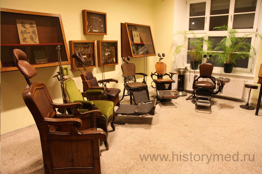 Есть практически уникальные зубные кресла. От деревянного (примерно 1870-е годы) до чугунного на гидравлической ноге (Ritter, 1940-е годы). Всего их 10 типов.