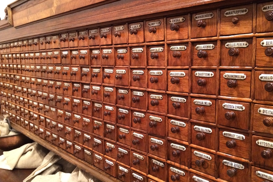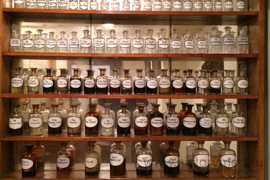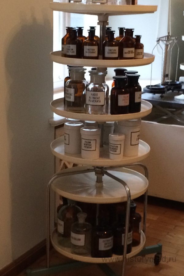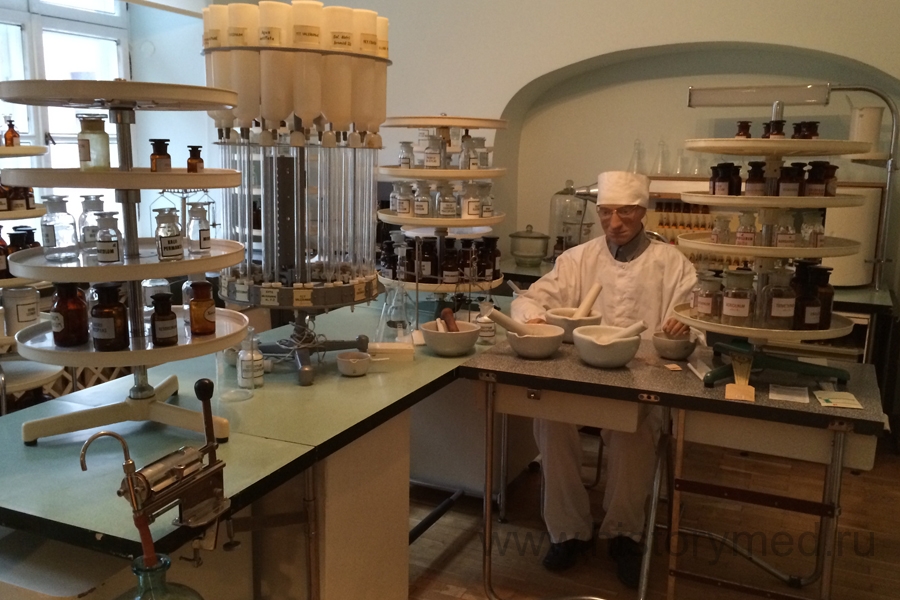 Продолжая наше путешествие по музею, мы попали в комнату, которая стилизована под настоящую, функционирующую аптеку, в которой есть ассистентская (она предназначалась для приготовления лекарств) и прилавок, где отпускался товар. За дверью в ассистентскую нас ожидала ожившая экспозиция.
