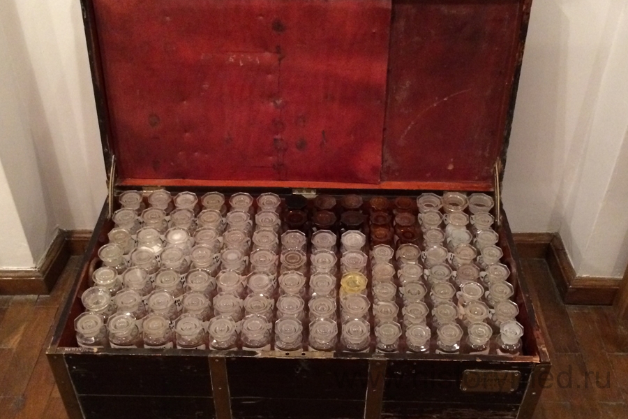Пройдя во второй зал, мы продолжили знакомство с аптечной утварью XVIII – XIX веков. Большой интерес у всех вызвал с виду совершенно обычный черный сундук. Однако, открыв его, мы увидели массу пузырьков для лекарств. Многозначительный вопрос - «Что это?» - возник сразу. Это был походный сундук с лекарственными средствами врача, который повсюду сопровождал Екатерину II. Также в представленной экспозиции нас удивили такой факт, что названия фармакологических фирм NIVEA и BAYER существовали уже сто лет назад.