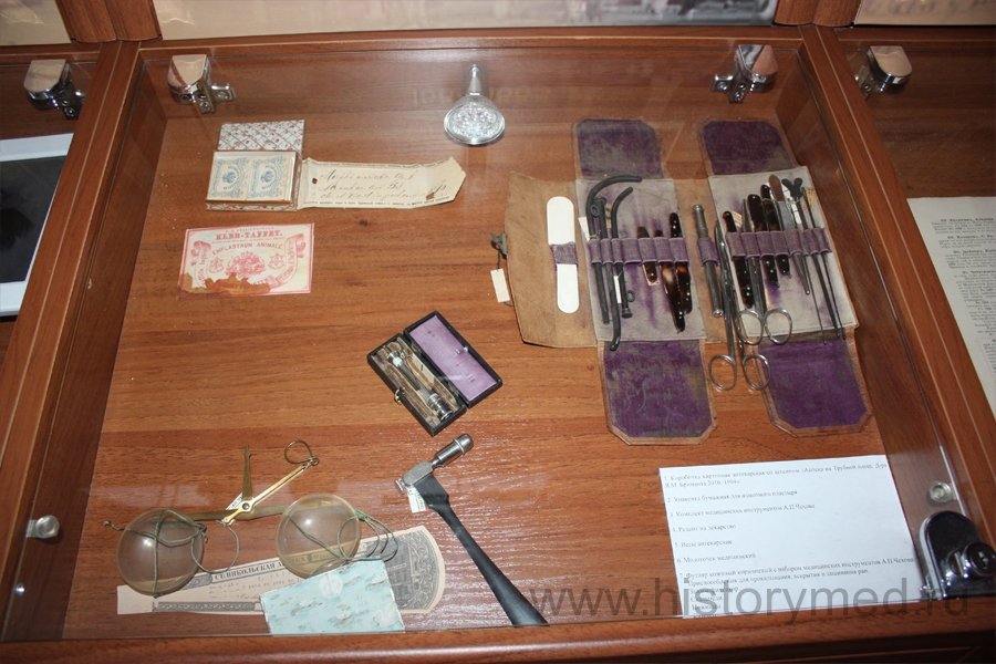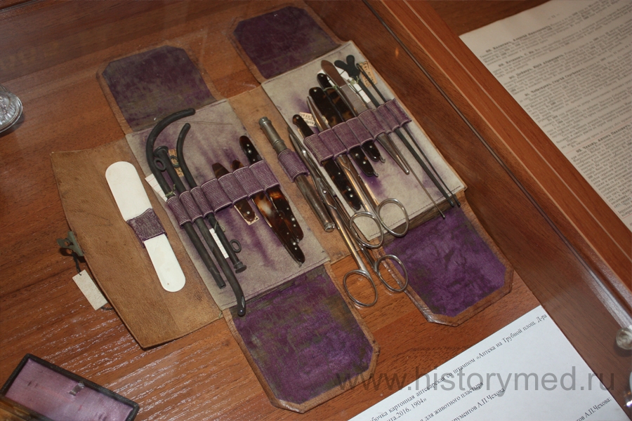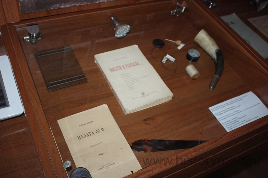 Медицинское наследие не велико. Однако «Палата № 6» в витрине вместе с набором медицинских инструментов выглядят умилительно. Набор инструментов в кожаном футляре вполне традиционен для этой эпохи. Ланцеты, ножницы, катетер, зонды – все это имел при себе практически каждый практикующий врач.