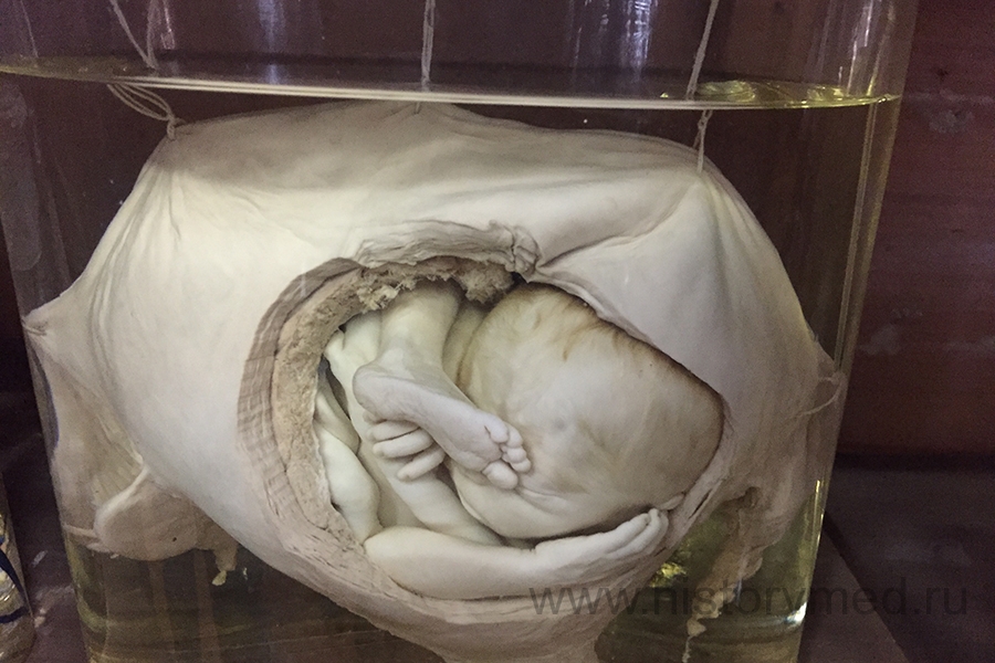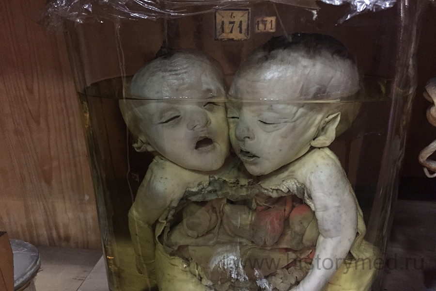 Влажных препаратов очень мало. Но зато какие! Беременная матка, сиамские близнецы со сросшимися черепами и грудной клеткой. Сейчас о таких работах можно только мечтать.