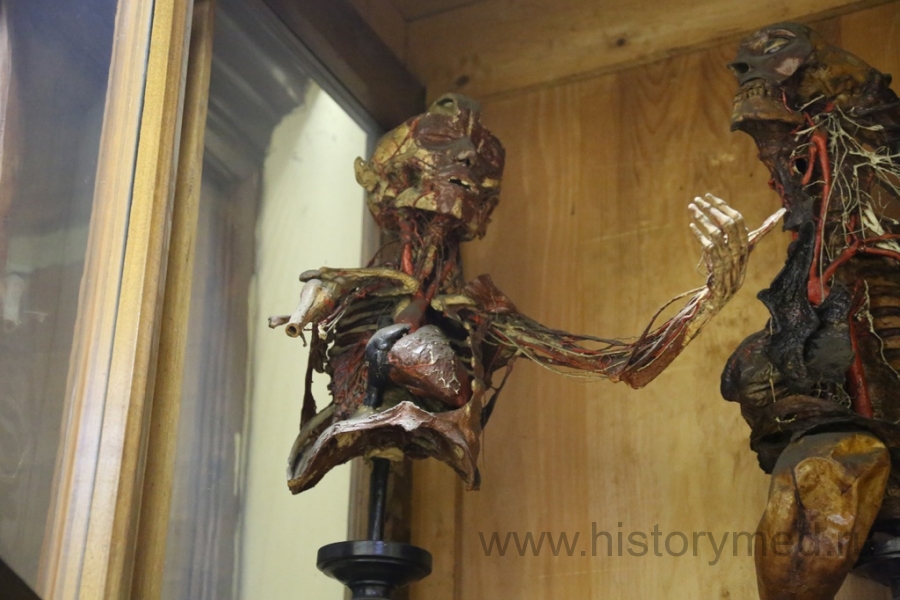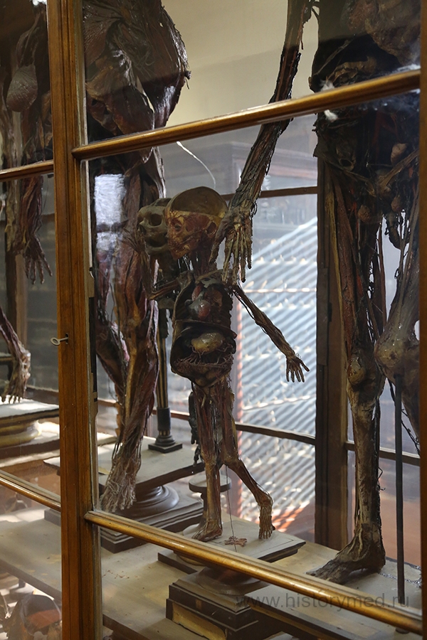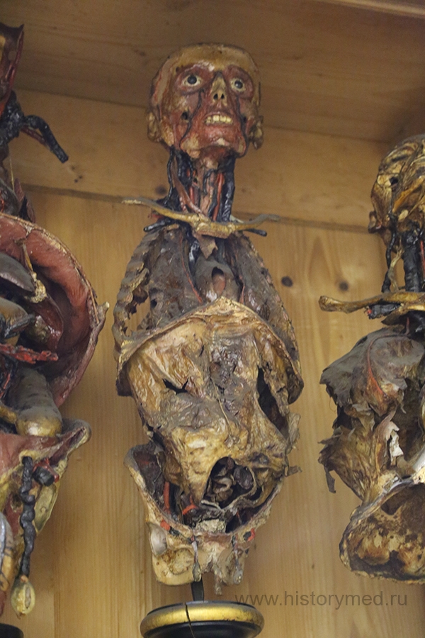 Большинство экспонатов – это привычная для Италии очень искусная восковая работа. Есть необычные образцы, в которых препарирована опорно-двигательная система. Мышцы закреплены специальным составом, вероятнее всего на основе воска. Именно эта техника и позволила препаратам преодолеть вековой рубеж.
