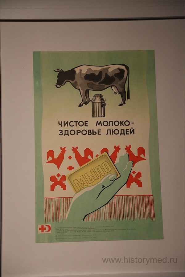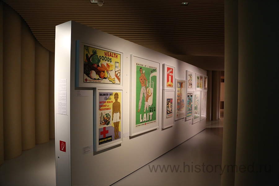 Экспозиция, посвященная информационной работе общества, также занимает целый зал. Несколько тысяч плакатов со всего мира находится в архиве. В зале показано их немного, но на всех языках. Есть и плакат на русском. Невольно вспоминаем, какую же большую работу вел наш Красный Крест по санитарному просвещению, донорству, - и все за взнос в 30 копеек.