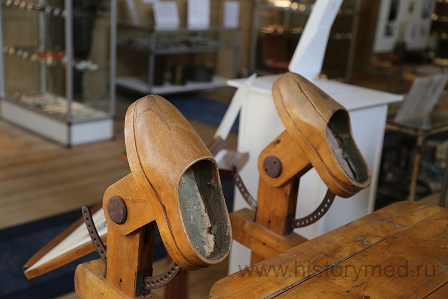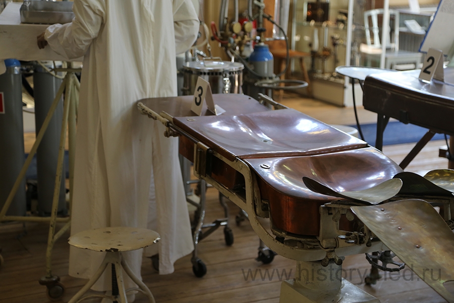 Абсолютная редкость - деревянный операционный стол и стул для хирурга. Очевидно, конец XIX века. Для фиксации стоп пациента сделаны специальные деревянные туфельки. Выполнить ортопедическое или хирургическое вмешательство на таком столе было не проблемой.