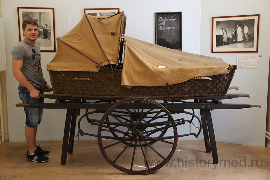 Совершенно уникальной выглядит повозка с носилками из прутьев (как корзина) для перевозки больных. Очевидно, что в движение ее приводила сама медицинская бригада. Таких повозок мы больше нигде не встречали.