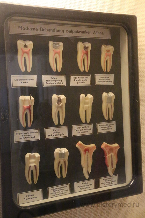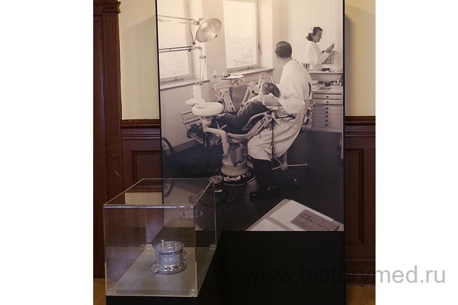 В экспозиции музея помимо традиционных таблиц поражений зубов, муляжей зубо-челюстной системы и инструментов, можно увидеть очень необычное приспособление для боров, напоминающее многоуровневую минажницу, а так же ватодержатель в форме шара со множеством отверстий. Зацепишь пинцетом или зондом через отверстие такого ватодержателя - и на инструменте окажется небольшой лоскуток такого нужного стоматологам материала. Очень интересная конструкция…